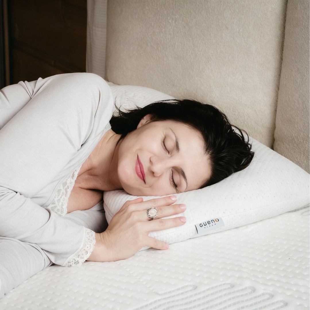 GUENO Softto jedna z tych poduszek, które najczęściej polecamy osobom śpiącym na boku i tym o większej budowie ciała. Jej wyższy profil dobrze wypełnia przestrzeń między barkiem a głową, dzięki temu kręgosłup zostaje ustawiony w linii prostej, a mięśnie szyi nie pracują przez całą noc.