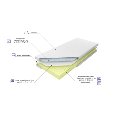 - Komfort Hard: gęsta pianka wysokoelastyczna, która amortyzuje nacisk na najcięższe partie sylwetki, zapewniając długotrwały komfort.