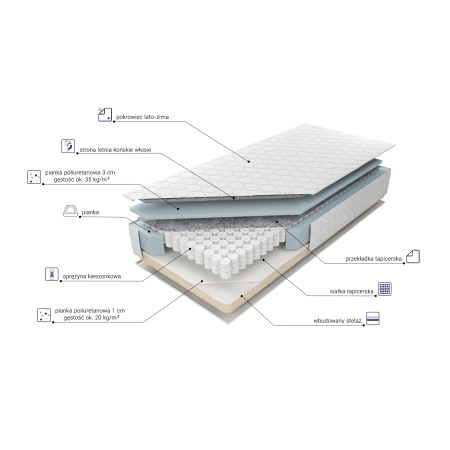 • higieniczność - oznacza poziom higieny jaki możemy długofalowo utrzymać w danym materacu, przestrzegając podstawowych zasad użytkowania materaca, określa także jego właściwości antyalergiczne