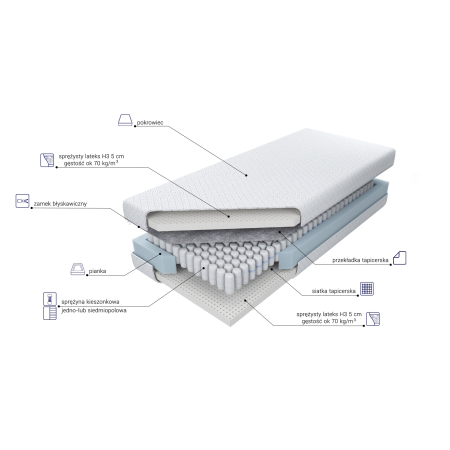 Rzeczywista długość i szerokość materaca może się różnić +/-2cm ze względu na pokrowiec. Produkt składa się z wybranego wkładu materaca oraz wybranego pokrowca.
