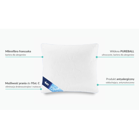 Poduszka pikowana polskiej produkcji AMZ MEDISENS to wyrób medyczny przyjazny alergikom i osobom cierpiącym na astmę. Bezpieczeństwo gwarantuje niespotykane na polskim rynku włókno wypełnienia PUREBALL posiadające prestiżowy atest ASTHMA&ALLERGY FRIENDLY dodatkowym atutem jest możliwość prania w temperaturze do 95 stopni C. Tkanina pokryciowa to miękka i przyjemna w dotyku mikrofibra francuska. Materiał jest jedwabisty w dotyku i równocześnie bardzo trwały. Poduszka AMZ Medisens to wyrób odpowiedni dla alergików i astmatyków co można potwierdzić licznymi certyfikatami jakości.
