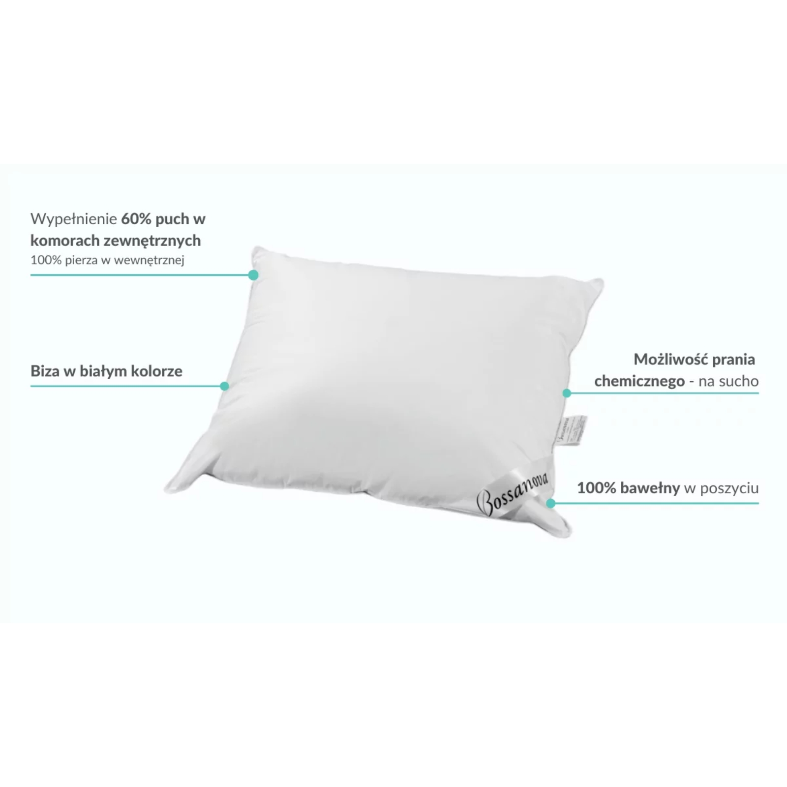 Poduszka puchowa Bossanova Sonno z wypełnieniem z puchu gęsiego 60% zapewnia wygodne i sprężyste podparcie dla głowy podczas snu. Wypełnienie pochodzi wyłącznie od polskich gęsi, a nasz rodzimy puch cieszy się uznaniem na rynku włókienniczym i jest uważany za jedno z najlepszych wypełnień poduszek oraz kołder na świecie.