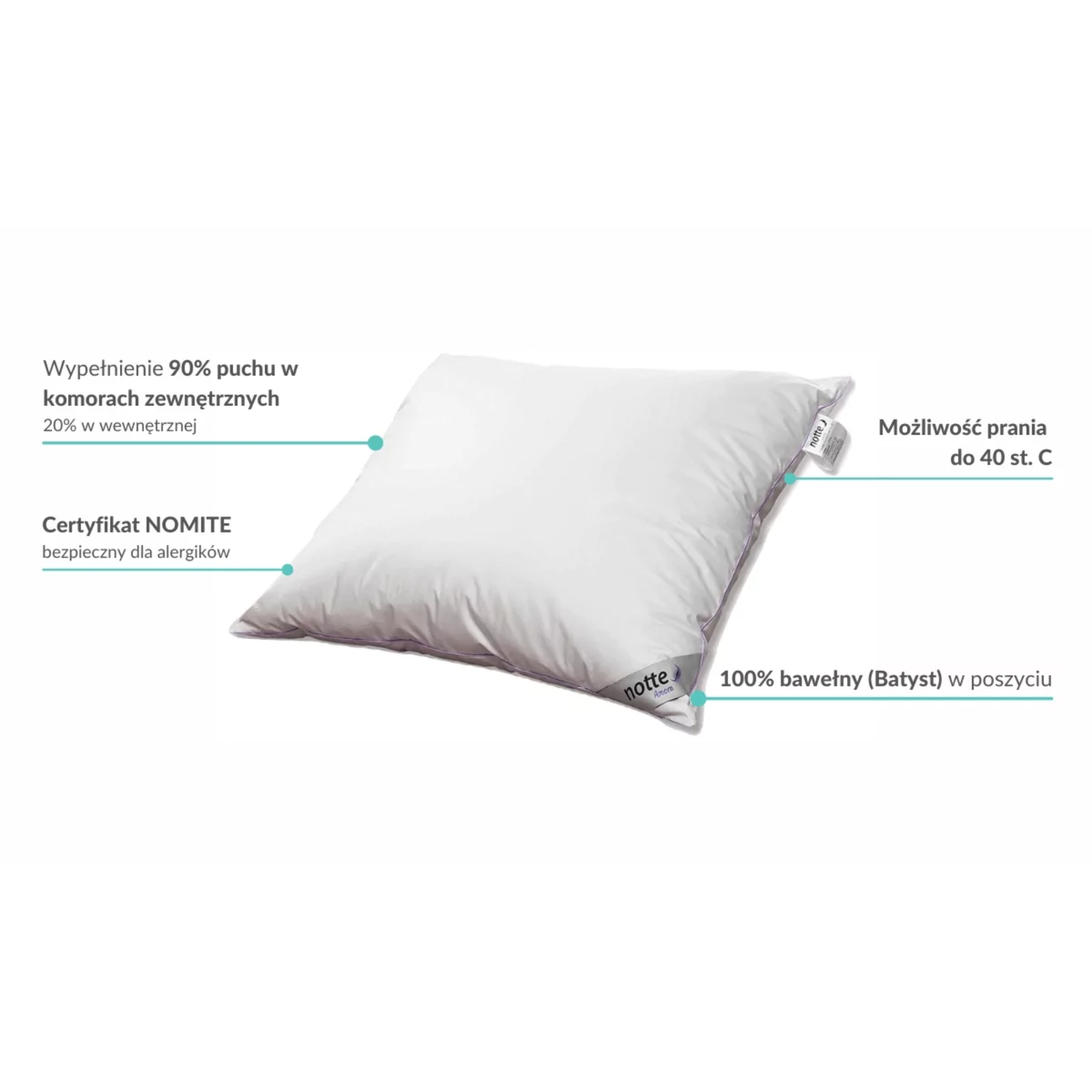 Poduszka puchowa NOTTE AMORE jest niesamowicie wygodna i dobra na każdą porę roku. Posiada wypełnienie z puchu gęsiego aż 90% w komorach zewnętrznych.