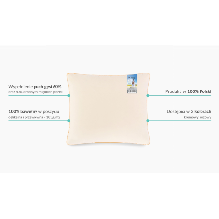 • poduszka MR PILLOW 60% wypełniona jest puchem gęsim 60% oraz pokryta mocnym inletem bawełnianym o gramaturze 185 g/m2,
