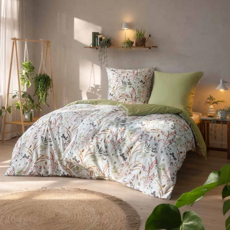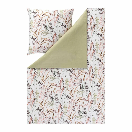 Pościel Maria to spotkanie natury i subtelnej elegancji. Jej wzór inspirowany dziką łąką w letnim słońcu wprowadza do sypialni ciepło i spokój. Na jasnym tle rozkwitają delikatne kwiaty i trawy w odcieniach koralu, brązu, zieleni i czerni, tworząc kompozycję, która uspokaja zmysły i dodaje wnętrzu przytulności. Dwustronny design pozwala w kilka chwil odmienić charakter sypialni, z kwiecistego pejzażu na jednolitą, limową przestrzeń pełną świeżości. Dzięki temu pościel Maria z łatwością dopasowuje się do nastroju i pory roku. Wykonana z bio bawełny o gęstym, a jednocześnie miękkim splocie, zapewnia przewiewność i wyjątkowy komfort snu. To połączenie naturalnego stylu i delikatności, które sprawia, że każda noc staje się chwilą wyciszenia i regeneracji.
