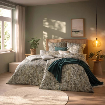 Pościel Jannis jest jak spokojny oddech po całym dniu, miękka, delikatna i przyjemna dla skóry, taka, że od razu czujesz, jak napięcie z ciała po prostu znika. Subtelny rysunek liści nie przytłacza, tylko wprowadza rytm natury i porządek w przestrzeni. Kolory szałwii, lnu i kremu rozjaśniają sypialnię i dodają jej lekkości niezależnie od pory roku. To pościel dla tych, którzy cenią prostotę i chcą, żeby ich sypialnia naprawdę dawała wytchnienie. Z Jannis wszystko zwalnia. I ciało, i myśli.